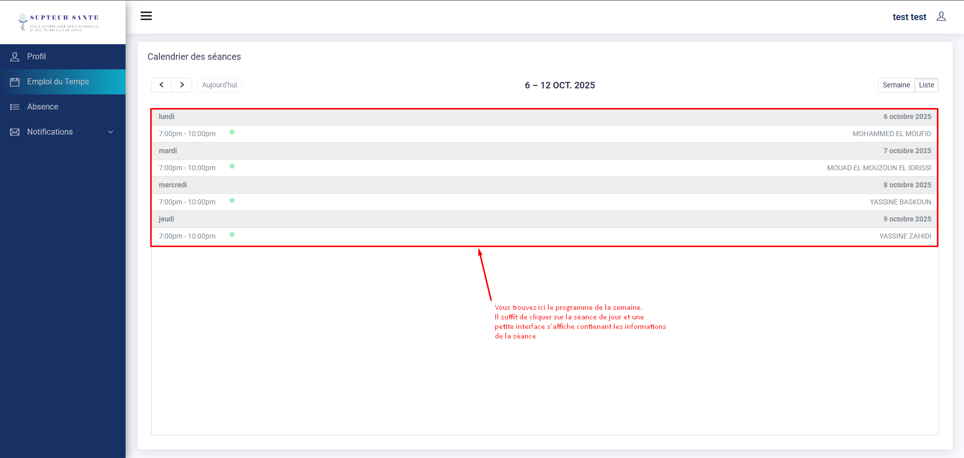 Elle présente un calendrier contenant les séances de la semaine.